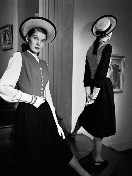 слева — фотография Сержа Балкина для Vogue, 1947 г. справа — «The Bar Suit», 1947 г.