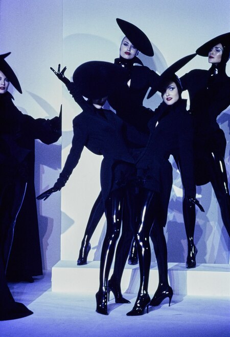 На показах дизайнеры представляли образы на тему киберпанка, соблюдая принцип чистоты и минимализма. Одним из таких был Тьерри Мюглер, который в этот раз заглянул в будущее, представив коллекцию роботов-киборгов в осенне-зимней коллекции 1995 года.