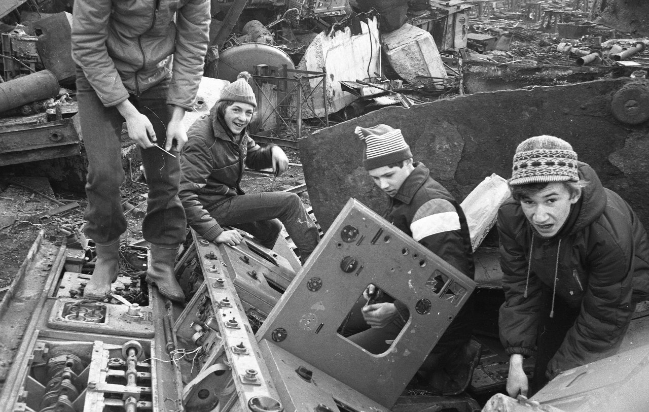 Если говорить об именах, остановимся на личности Сергея Подгоркова. Он был документалистом, снимал как есть: серые подворотни, старые киоски, дворы-колодцы, огромные человеческие очереди — визитная карточка тех времен. В его архивах можно увидеть пивные ларьки, городских сумасшедших, просто улицы. Голая реальность в настоящий момент. Фото: Пионеры курочат подлодку. Угольная гавань, Ленинград, 1970-е. Автор: Сергей Подгорков