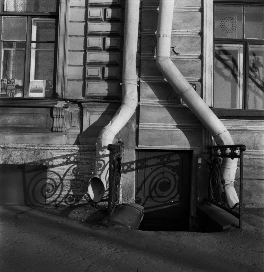 В данном разделе будет рассмотрен стилистический аспект в работах ленинградских неофициальных фотографов 80-х годов. Несомненно, каждый из рассматриваемых нами фотохудожников-андеграундеров видел город через свой авторский взгляд. И здесь стоит сказать, что два объекта или события, снятые в один момент разными авторами будут непохожи не только ракурсами и свето-теневым распределением, но и авторским стилем, композицией, видением конкретного фотографа. Каждый старался выработать такой стиль, отличающий его отпечатки от других. На фото: Водосточные трубы, 1988 г. Фотограф: Мария Снигиревская.