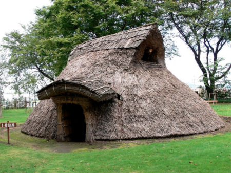 К периоду Дзёмон (примерно 14 000 до н. э. — 300 до н. э.) относят первые зафиксированные архитектурные формы на японских островах. Базовая модель жилья этого времени представляет собой полуземлянки с двускатной крышей и деревянными столбами внутри. Современные историки назвали их «тата-ана-дзюкё», что дословно означает «дом в яме». Важно отметить, что уже на этом этапе крыша превалирует над всем объемом здания.