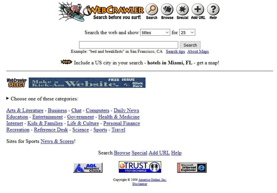 Помимо вышеупомянутой поисковой системы существуют и другие, которые появляются даже раньше — от Archie и WebCrawler до японских и европейских каталогов. Они используют простые интерфейсы и минимальное количество графики. Уже тогда начинают появляться рекламные баннеры и текстовые вставки. Плашки с информацией выстраиваются относительно хаотично, но самое важное, что текст остается читабельным и выполняет свою основную функцию — формируется ранний опыт сосуществования поиска и коммерческого контента.