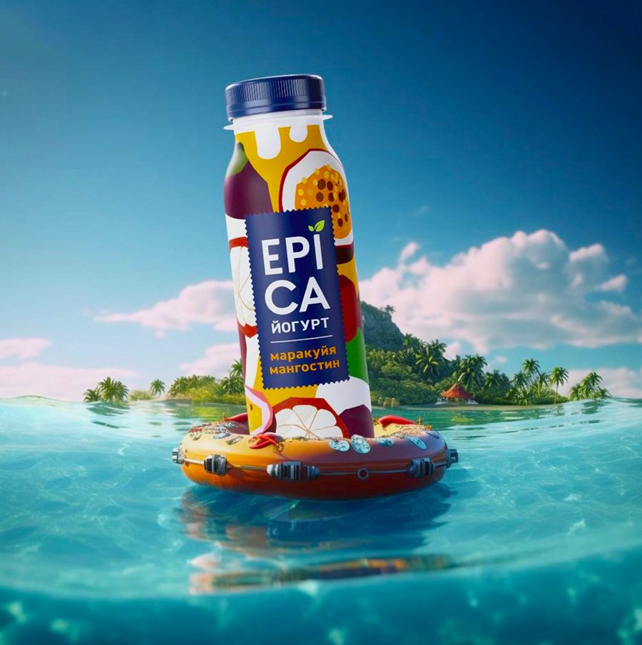 Epica — Рекламный макет с питьевым йогуртом «маракуйя-мангостин». 2024 г. // Epica — Рекламный макет с йогуртом «клубника». 2024 г.