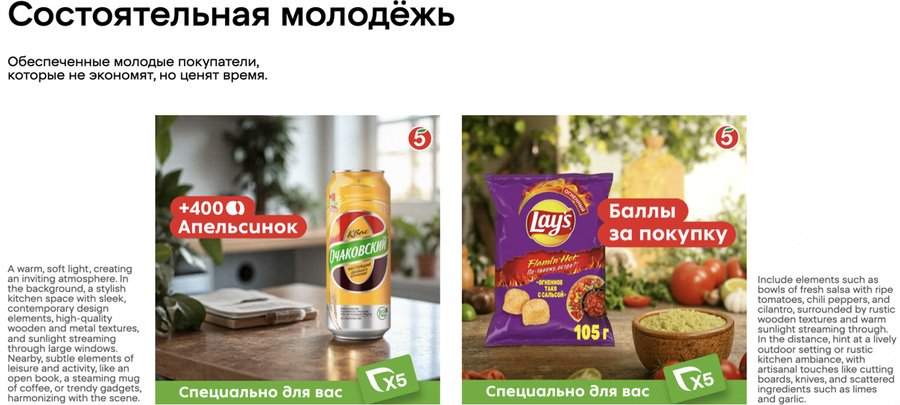 Искусственный интеллект интегрируют в работу даже крупные корпорации, например X5. Дизайнеры, используя генеративную графику, создают серию персонализированных баннеров для разных сегментов ЦА. Команда получает множество вариантов за короткий промежуток времени. Таким образом сокращается путь от идеи до реализации, а визуальный язык бренда становится динамичнее.