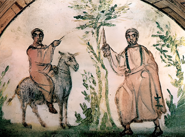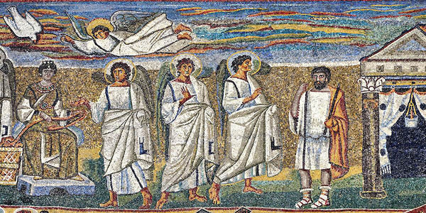 Первоначально ангелов изображали иначе, чем мы привыкли видеть их сегодня — как божественных существ с крыльями и нимбами. В первые века христианского искусства их представляли в образе молодых юношей или взрослых бородатых мужчин с обычными, земными чертами, без каких-либо особых атрибутов или признаков священного статуса. Это связано с тем, что в библейских текстах ангелы выступают посланниками Бога и при общении с людьми должны были скрывать свою божественную природу. Одним из ранних примеров такого изображения является Архангел Гавриил во второй половине III века в катакомбах Присциллы в Риме [1].