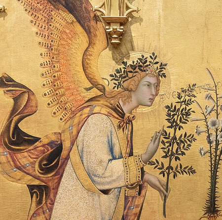 Наиболее наглядно готическое понимание ангельского образа проявляется в этой картине. Архангел Гавриил изображен на коленях перед Мадонной, только что сошедшим с небес. Его крылья распахнуты, плащ слегка развевается, создавая ощущение небесной воздушности. Лицо ангела выражает мягкую, сдержанную эмоцию, отражая благоговение и величие момента. Тонкая прорисовка крыльев, плавные линии одежды и позолоченный фон создают впечатление гармонии и грации. Гавриил выглядит небесным, но живым и индивидуализированным, что демонстрирует стремление мастеров объединить духовную идеальность с более естественной формой ангела.