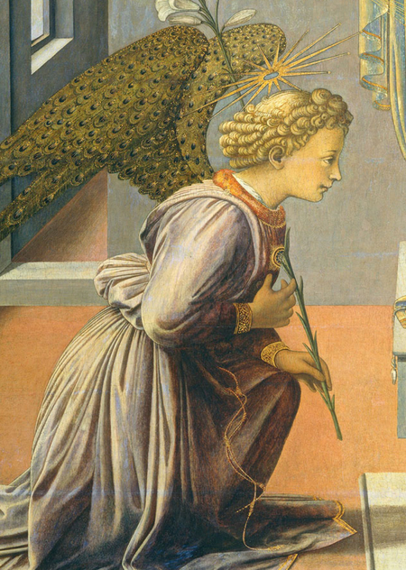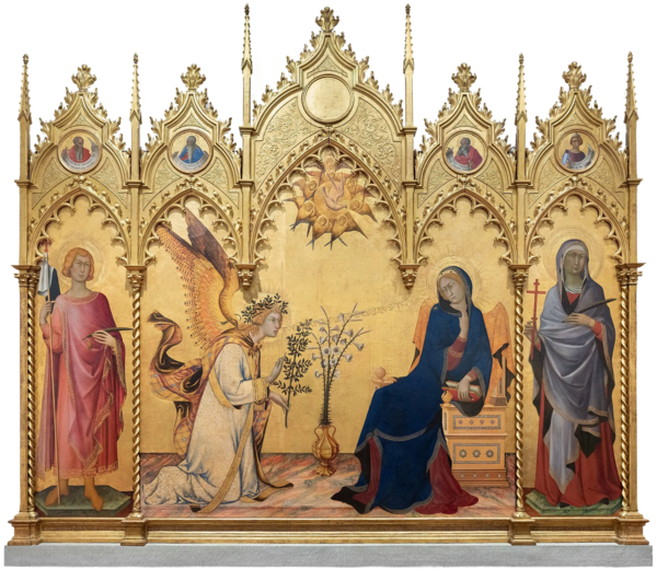 Ещё один пример, где отражается устоявшаяся тенденция готической живописи — «Благовещение со святыми». Парящий Архангел Гавриил слева от Девы Марии представлен с расправленными крыльями и мягкой, сдержанной мимикой, подчеркивающей его благоговение. Образ утончен и индивидуализирован, что делает ангела близким зрителю.