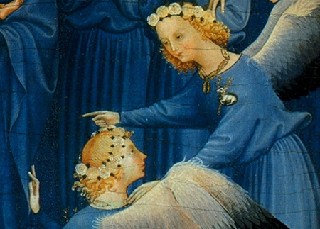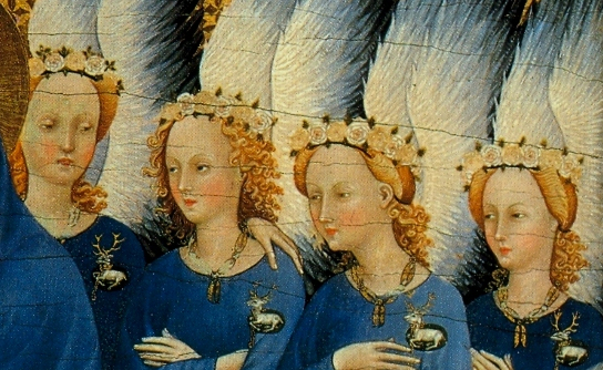 Похожая концепция проявляется и в «Уилтонском диптихе». Здесь ангелы изображены утонченными и идеализированными, с мягкими почти юными чертами лица. Цвет одежды и венки из роз подчёркивают их небесную чистоту, а скрещённые руки — жесты почтения и смирения, показывающие преданность Деве Марии. Ангелы не просто декоративны: они активно присутствуют в композиции, соединяя духовность с утонченной формой.
