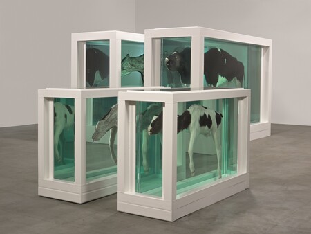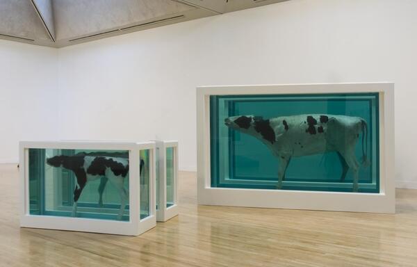 Одна из самых известных и провокационных работ Херста — инсталляция с распиленными коровой и телёнком в аквариумах с формальдегидом. Зритель может пройти между их половинами, что превращает религиозный образ Мадонны с младенцем в анатомическое зрелище.