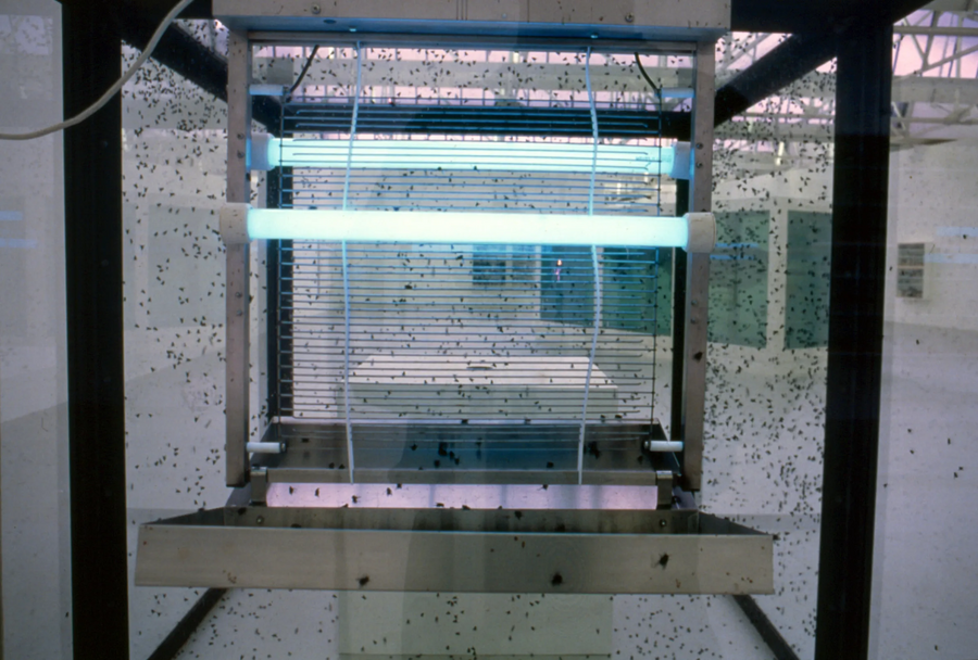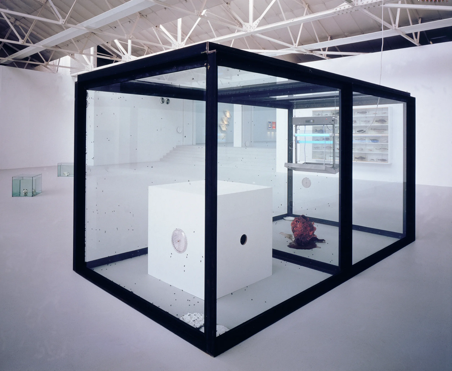 Одна из ранних и самых шокирующих работ Херста. «Тысяча лет» — стеклянная витрина с мертвой коровьей головой, мухами, личинками и инсектицидной лампой. Мухи рождаются, питаются, умирают от тока — создавая цикл жизни и смерти в реальном времени.