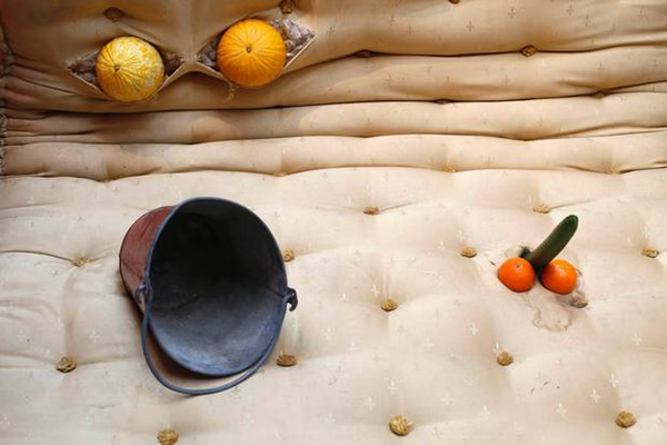 Инсталляция — матрас, апельсины, огурец, ведро и капронки — образует абсурдную сцену, аллюзию на гетеросексуальный акт. Здесь нет тел и страсти — только символы и ирония, подрывающие привычные представления о сексуальности и гендере.