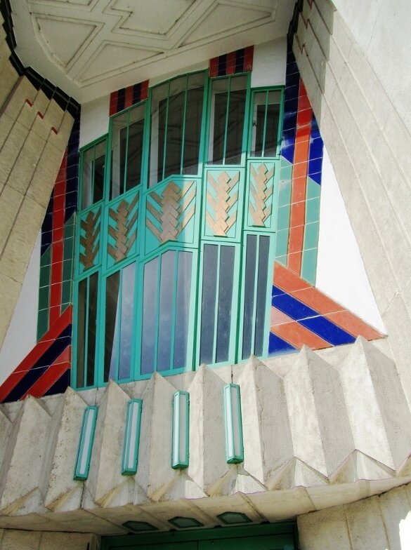 Классическое симметрия и пропорция создают сбалансированную композицию, поддерживающую монументальность сооружения. Фасад украшен рельефными фризами, колоннами с вертикальным рифлением и геометрическими узорами — эти детали хоть и отсылают к традиционному декоративному искусству, но выполнены они в упрощённой стилизованной форме, характерной Ар-деко.