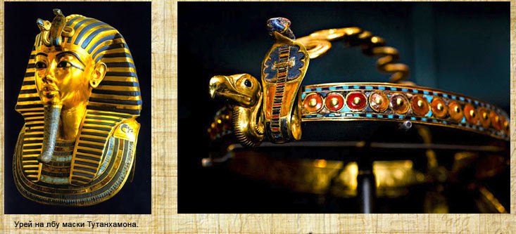 Статуя фараона Хафра IV династия. Бронзовая статуя времён Древнего Царства, На фресках изображение фараона легко отличить- это змей на клафте Изображение змеи (урея) на клафте как один из символов, по которым можно было отличить фараона в Древнем Египте. Змий символизировал не только мудрость, но и власть над жизнью. Фараона считались божеством, и все фараоны считались бессмертными.