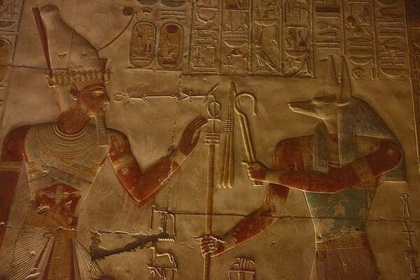 Фараон отдает свой посох Анубису в Царстве мертвых –у фараона на изображении только посох но и другие атрибуты, борода, урей и головной убор –такой носили фараоны в древности в эпоху первых династий.