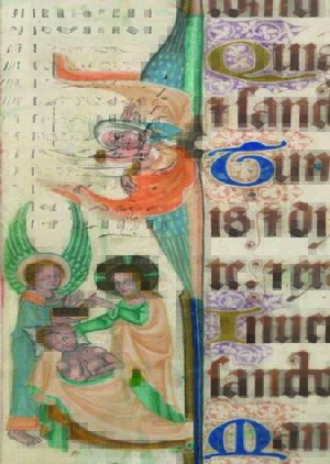Дует в зад… Изображение // Маастрихтский часослов. Бельгия, Льеж, первая четверть XIV века. — Лондон: Британская библиотека. URL: https://www.bl.uk/ (Дата обращения: 05.11.2025).