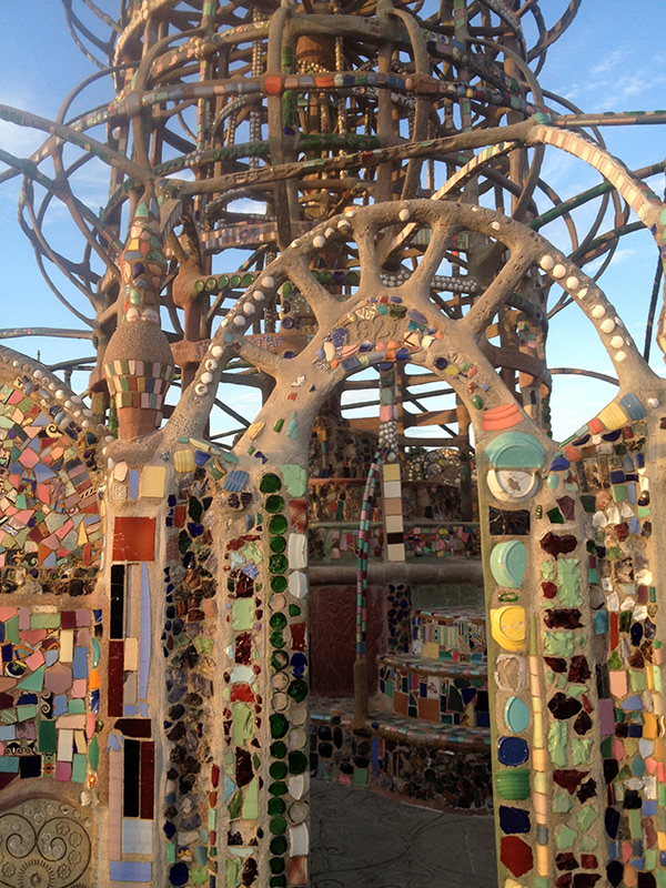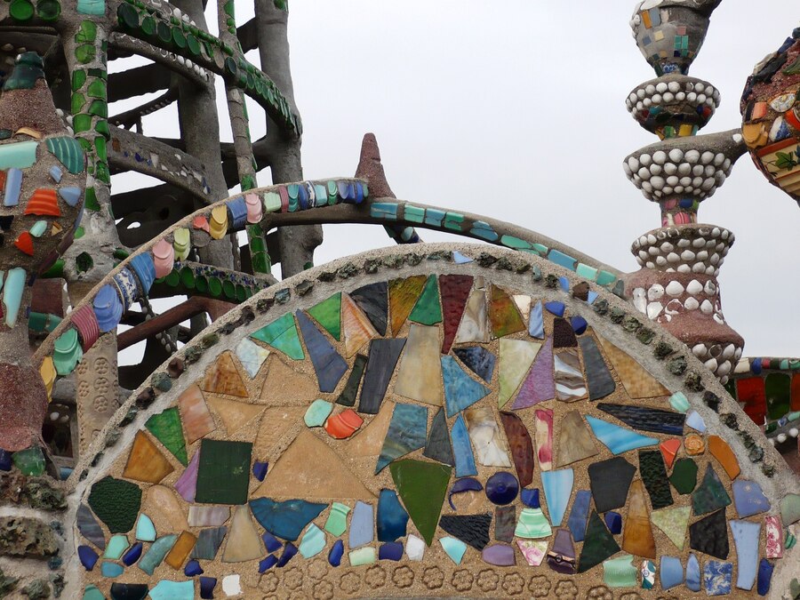 В Watts Towers именно рутина определяет окончательный вид. Саймон Родиа работал один, ежедневно, более тридцати лет — поднимал бетон вручную, укреплял проволокой, добавлял новые фрагменты. На поверхности башен можно различить множество этапов работы: участки с разным составом цемента, детали, приклеенные позже, отдельные фрагменты, укреплённые повторно. Несовпадение высоты слоёв, неровные стыки и следы повторных попыток укрепления конструкции показывают, что строительство не было спроектировано заранее. Это была повседневная рутина, которая постепенно формировала архитектуру.