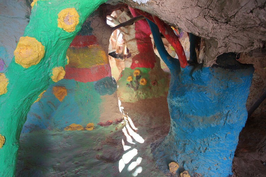 К смеси, которая играла роль основы, добавляются покрышки, древесина, окна, фанера. Ключевыми для пространства стали многочисленные литры краски, которую Найт получал от местных жителей. Вся структура холма отражает специфику бедной пустынной среды, где строительный материал определяется географией и отсутствием ресурсов.