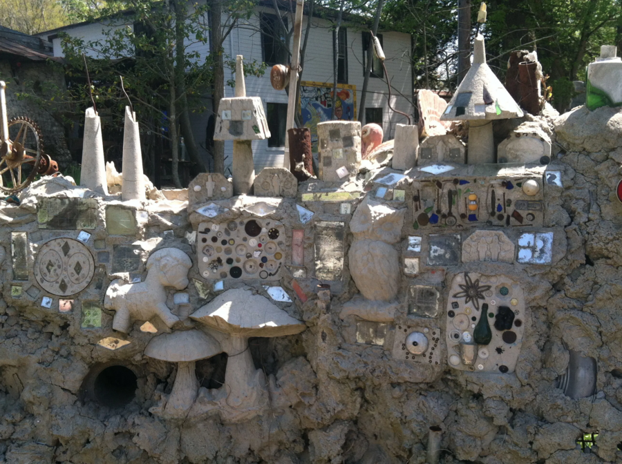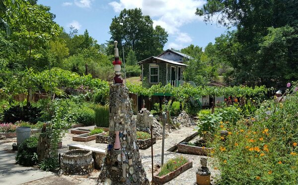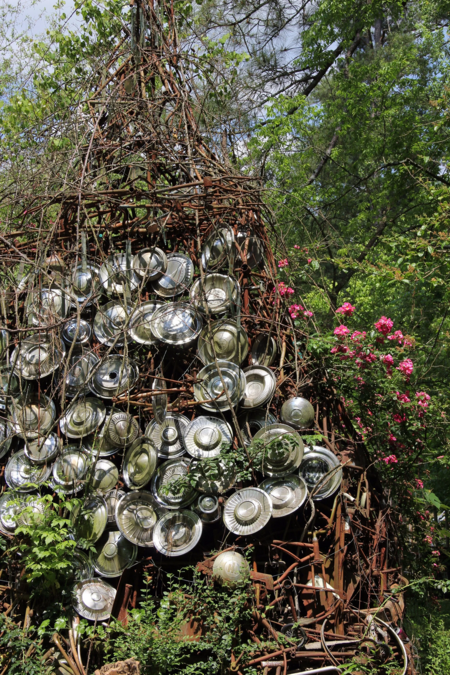 Paradise Garden Ховарда Финстера также построен из того, что оказалось доступным в его окружении: металлических предметов, автомобильных частей, бытовых вещей, фрагментов стекла и дерева, элементов массового производства. Эти объекты характерны для южных штатов США, где автомагистральная культура и широкая доступность хозяйственных магазинов формируют специфический набор отходов. Визуальный анализ среды показывает, что материал подбирался не по эстетическому принципу, а тоже по признаку доступности.