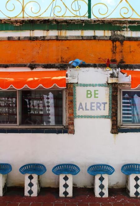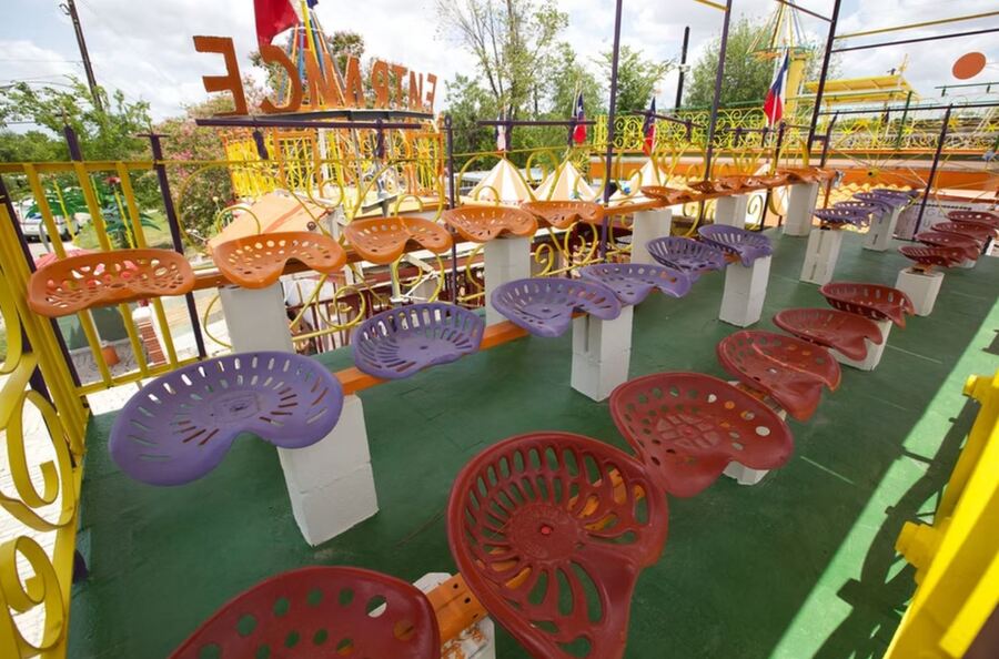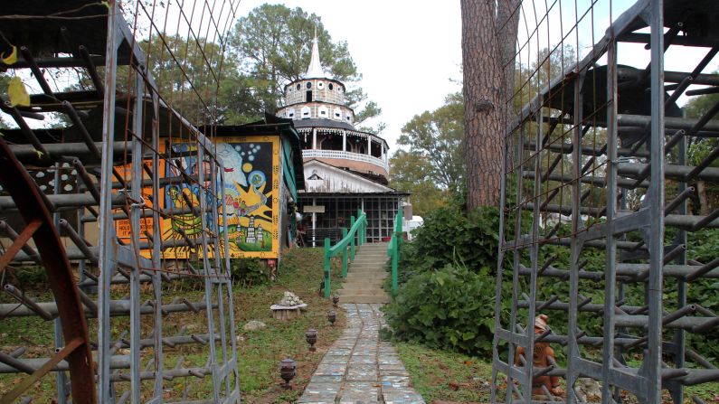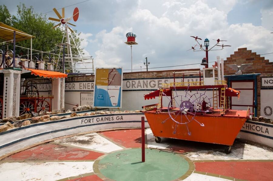 The Orange Show МакКиссэка тоже несёт следы многолетнего труда: ржавчина на металлических конструкциях, частично перекрашенные участки, многократно укреплённые ступени, повторяющиеся фрагменты плитки, наложенные в разное время. Визуально это создаёт ощущение «доработанного» объекта — не завершённого раз и навсегда, а поддерживаемого в ходе тысяч мелких действий.