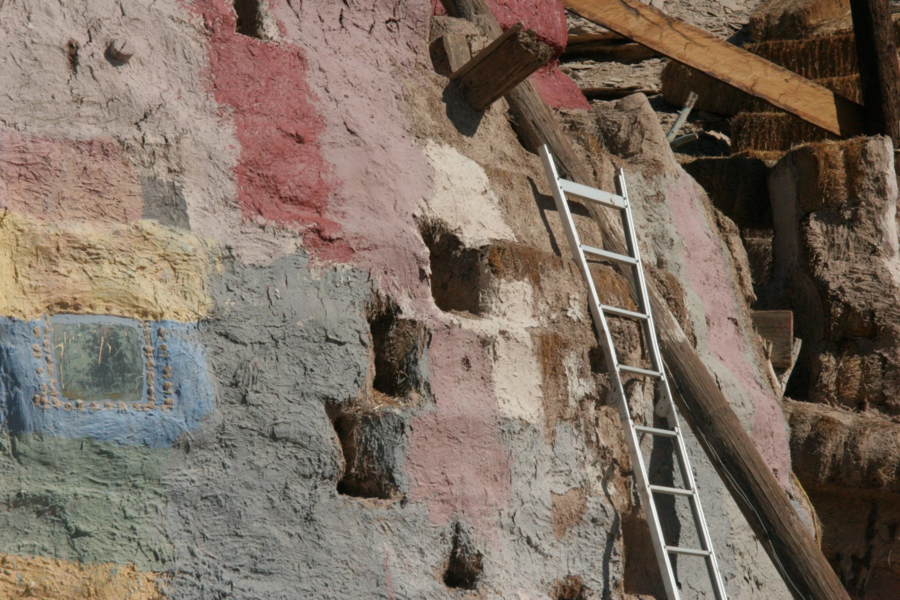 В Salvation Mountain трудовая составляющая особенно заметна из-за хрупкости материала в связи с климатическими условиями местоположения. Найт постоянно укреплял поверхность, наносил новые слои краски, закрывал трещины, которые появлялись из-за палящего солнца, наращивал конструкцию вручную. На холме видно, как слои краски перекрывают друг друга, напоминают кольца роста дерева: каждый слой — это один рабочий цикл. Неровная поверхность — не декоративный эффект, а результат того, что материал и климат требовали постоянного ремонта. Строительство превращается в непрерывный, почти непрекращающийся процесс поддержания.
