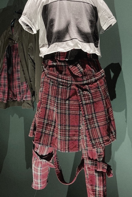 Костюм в фильме «Великое рок-н-ролльное надувательство» на Малкольме Макларене, созданный Вивьен Вествуд, как раз сочетает в себе и футболку с лозунгом, и клетчатый принт, а также модель бандажных брюк. которые являются ярким примером садомазохистских мотивов в панк культуре.