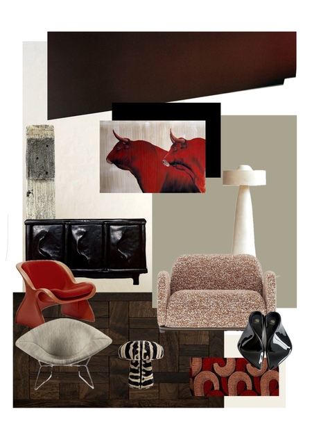 Перед тем, как приступить к созданию 3D коллажей интерьера, я создаю мудборд проекта, интуитивно собирая понравившееся по цвету и форме элементы и формируя «комнату» на листе. Зачастую подобные мудборды включают в себя объект искусства: картину или скульптуру.