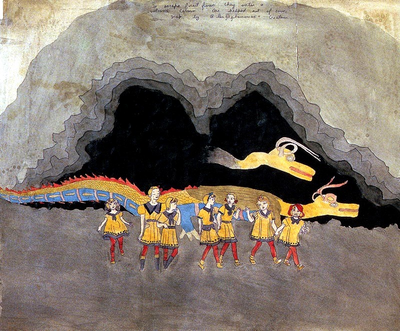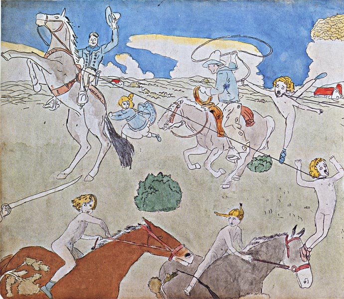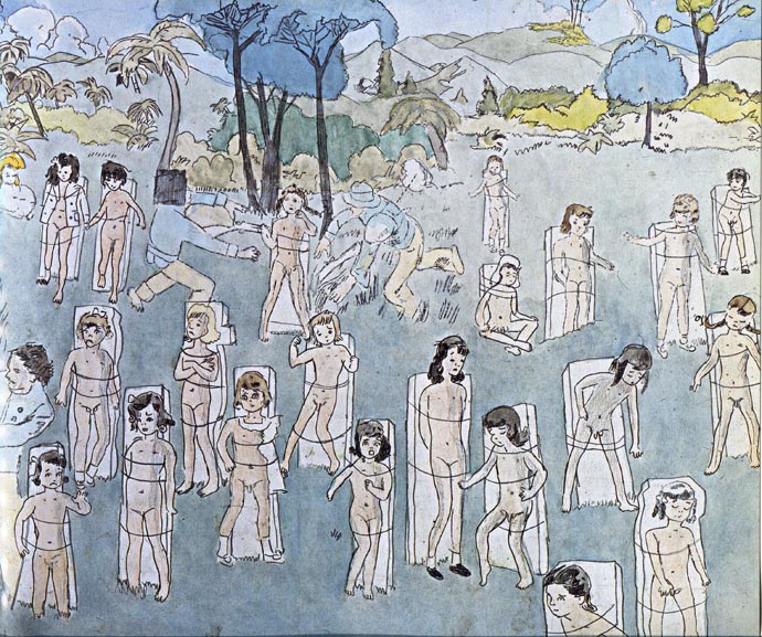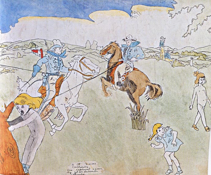 По этим работам можно видеть: как Дарджер создавал свои полотна. В этом случае он использовал и переведенные фотографии, и фотографии напрямую, создав коллаж.