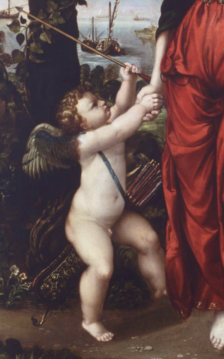 Смысл. Купидон в аллегорической функции: визуализирует конфликт плотской страсти и добродетели, что соотносится с гуманистическими дискуссиями XVI в. о нравственных гранях любовного чувства.