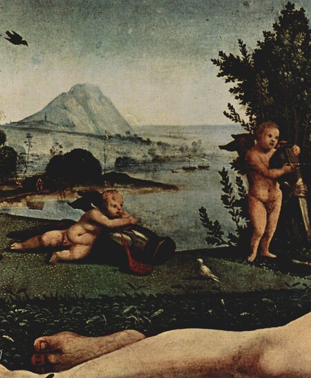 На картине Тициана «Любовь земная и Любовь небесная» (1514) изображены две Венеры — обнажённая небесная Венера, символизирующая платоническую, возвышенную любовь, и одетая земная Венера, олицетворяющая мирскую, социально-бытовую любовь; между ними стоит Купидон, который наклоняется над чашей-фонтаном и опускает руку в воду, что интерпретируется как символ очищения, самопознания или проверки «чистой» любви, и одновременно как живой, игривый акцент, связывающий оба мира — земной и небесный, тем самым подчёркивая двойственность, философскую глубину и многослойность концепции любви у Тициана. Аналитические статьи о сериях художника отмечают многозначие путти в его произведениях: они одновременно и играют декоративную роль, и служат семантическими маркерами смыслов полотна.