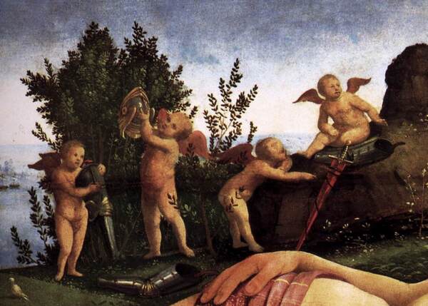 Высокое Возрождение (конец XV — начало XVI века) — период, когда в итальянском искусстве достигается синтез античного идеала, гуманистической мысли и вновь отточенных художественных приёмов: художники стремятся к идеальной пропорции, монументальной ясности композиции и выразительной пластике фигур, развивая язык, на котором можно передавать и чувственные, и философские смыслы. В это время образ Купидона становится активным участником повествования и носителем концептуальных смыслов — посредником между платонической идеей любви и её земными проявлениями; через жесты, атрибутику (стрелы, лук, венки) и композиционное положение амуры кодируют и моральные, и эстетические послания заказчика и художника. Византийско-итальянская теория и римские мастерские того времени формируют новую риторическую привычку: каждая деталь — от взгляда Купидона до убранства фона — может быть прочитана как часть философской «речи» о любви, красоте и власти покровительства.