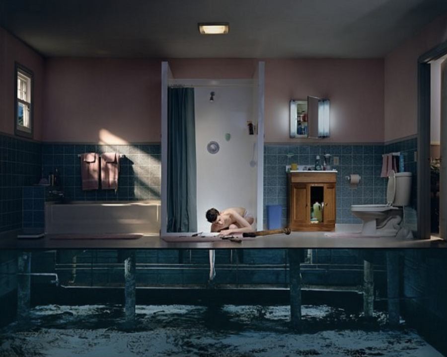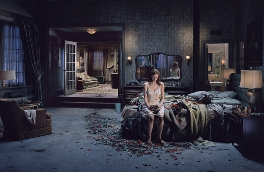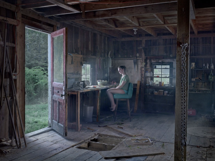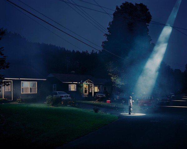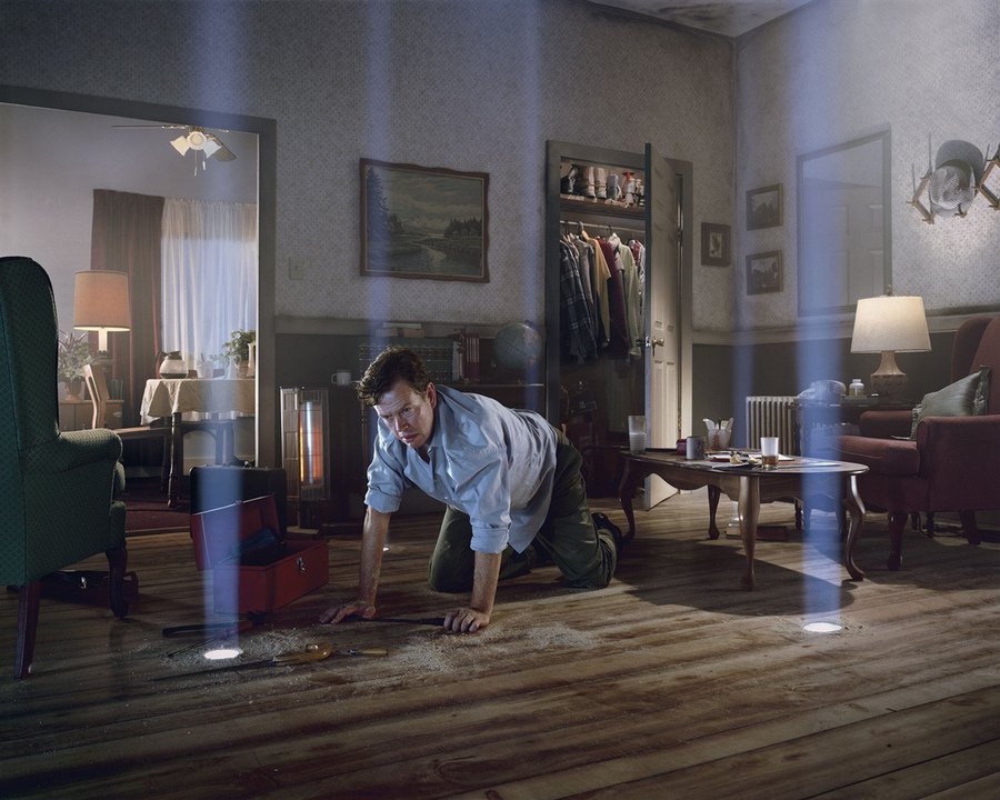 Фотографии Грегори Крюдсона развивают мотив визуальной тишины и одиночества в направлении глубоко театрализованной постановки, где каждый кадр напоминает стоп-кадр из несуществующего фильма. Его образы не стремятся к реалистичности — наоборот, они чрезмерно сконструированы, освещены, эмоционально перенасыщены, но при этом создают парадоксальное ощущение мёртвого времени, в котором не может произойти никакого действия.