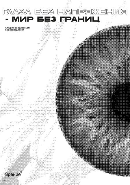 Графический элемент на заднем фоне представляет собой радиальные мышцы глаза, которые, в свою очередь, отвечают за регулирование количества света и степень фокусировки глаза. Также неоднородность этих точек подчеркивает хрупкость данного органа. Благодаря гармоничной работе этих мышц, глаз не напрягается и правильно адаптируется к условиям освещения, что отражает слоган плаката. «Глаза без напряжения — мир без границ» — это не просто слоган, это призыв открыть для себя истинную красоту жизни, свободной от усталости и дискомфорта. Когда глаза спокойны и отдыхают, перед нами раскрывается неограниченный простор — яркие краски природы, плавное движение облаков, глубокие взгляды близких и бесконечные горизонты мечтаний.