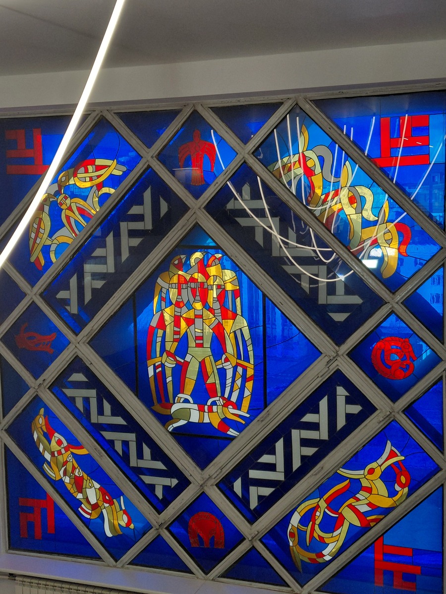 Серия витражей в интерьере отеля УРАЛ (Пермь, ул. Ленина 58) Витражи изготовлены по проекту художника Равиля Исмагилова в 1992 году.