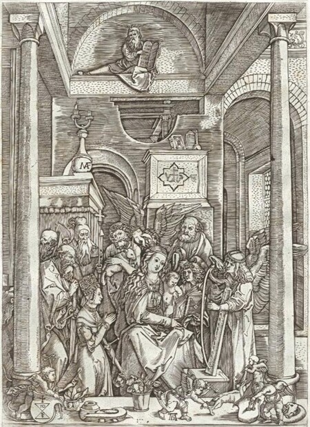 Поклонение Пресвятой Деве Марии с Младенцем и ангелами-апостолами, Дюрер, Германия, 1504 г. Поклонение Пресвятой Деве Марии с Младенцем и ангелами-апостолами, Раймонди, Италия, около 1504 г.