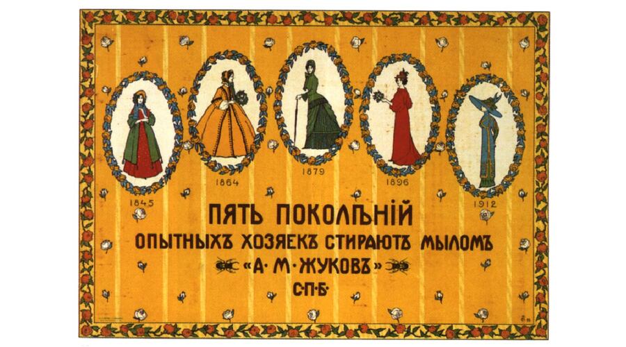 Стилизованная «русская красавица» в кокошнике и традиционном одеянии. Образ отсылает к допетровской Руси, создавая миф о «национальной чистоте» и связывая товар с аутентичной, «истинно русской» красотой. Женщина статична, ее взгляд отрешен, она — пассивный символ традиции, а не современница.