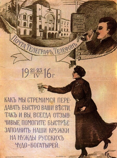 «Почта, телеграф, телефон. 21–23.IV.1 Как мы стремимся передавать быстро ваши вести, так и вы, всегда отзывчивые, помогите быстрее заполнить наши кружки на нужды русских чудо-богатырей» 1916
