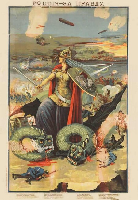 Плакат «Россия — за правду» создан неизвестным художником и выпущен типо-литографией И. М. Машистова 1914