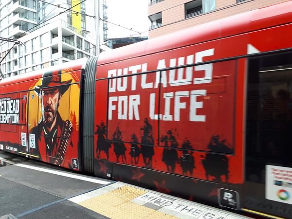 Самым заметным элементом офлайн-рекламы стала крупная наружная кампания. В Нью-Йорке, Лондоне, Мадриде и Токио появились гигантские муралы и билборды с минималистичными красно-чёрными постерами, которые стали частью городской среды. Многие муралы рисовали вручную, что само по себе превращало рекламу в событие — фотографии стен появлялись в Twitter и Instagram задолго до релиза игры. Некоторые билборды в США и Европе становились точками «паломничества» фанатов, которые выкладывали фотографии с тегами #RDR2, усиливая органический охват.