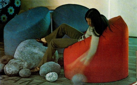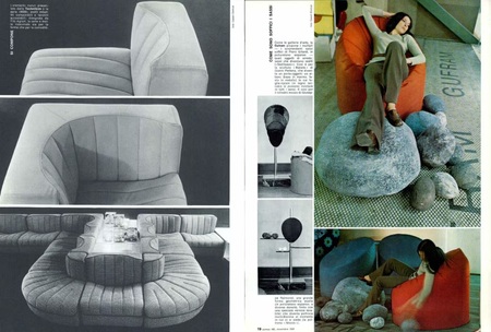 Слева — Пьеро Джиларди, пуф Sedilsasso, 1969; справа — разворот журнала Domus № 480, ноябрь 1969