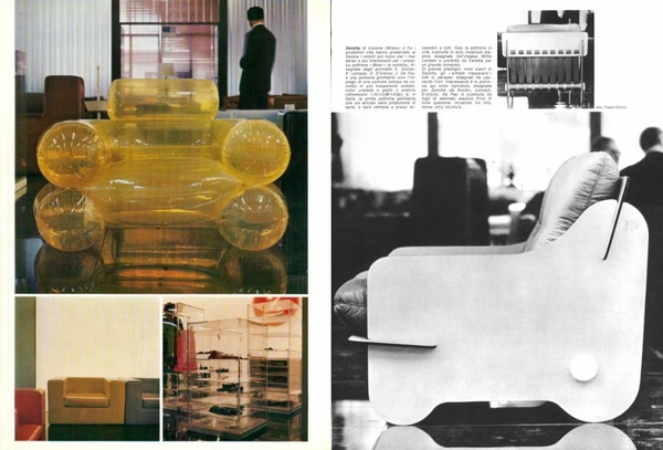 Слева — Де Пас, Д’Урбино, Ломацци; кресло Blow, 1967; справа — разворот журнала Domus № 456, ноябрь 1967