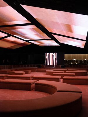 Появляются экспозиции, где зритель включён в переживание: например павильон Hermès (2011) с бумагой и бамбуком (см. фото. выше), а также стенд Moroso с тактильными тканями и отсылками к природным цветам и переработанным фактурам (см. фото ниже).