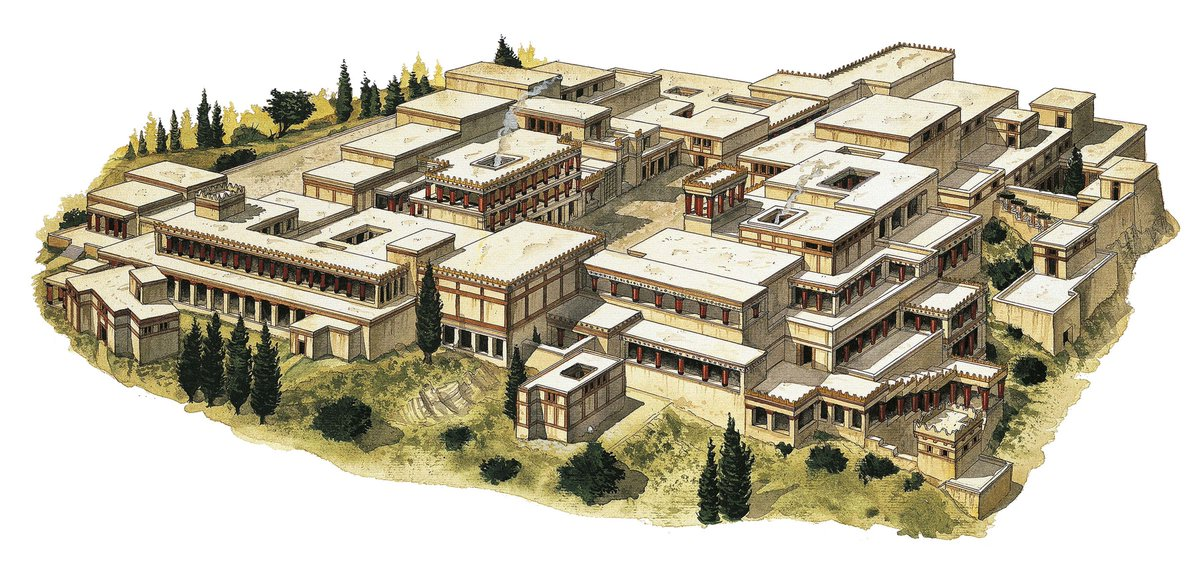 Что же такое дворцовый комплекс? Это несколько зданий, которые предназначены для правящей семьи, проведения церемоний и встречи с важными гостями. На территории комплекса также могут находиться храмы, водоемы, сады и жилища слуг. Можно сказать, что дворцы- это не только архитектурная гордость государства, но и символ власти и могущества. С их помощью подчеркивали величие и многогранность возможностей царя, ведь при приглашении послов из других государств нужно демонстрировать достижения цивилизации. Одним из самых известных дворцовых комплексов является Кносский дворец на острове Крит. Ему хотелось бы уделить отдельное место в данном визуальном исследовании, поскольку он стал символом могущества минойской цивилизации.