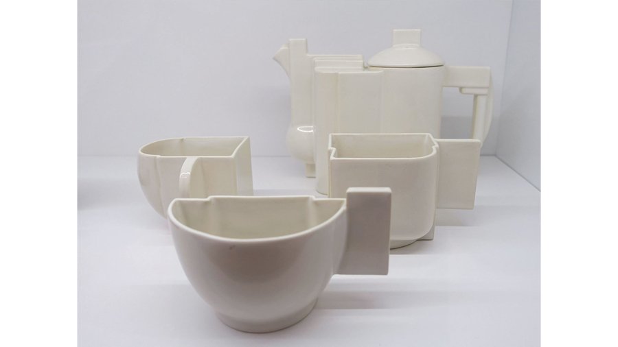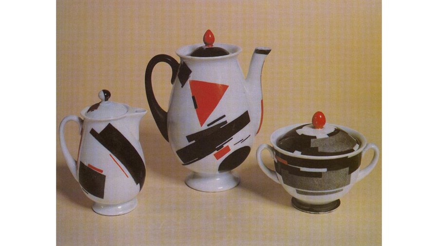 Николай Суетин, предметы из кофейного сервиза, 1923 г.; предметы из чайного сервиза, 1923 г.; чайный сервиз «Бабы», 1930 г.