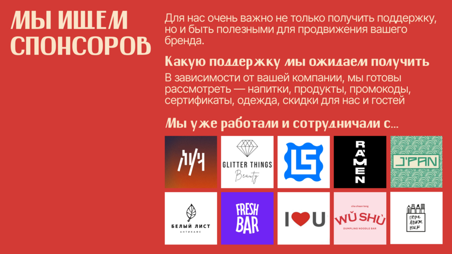 В этом году я исполняла обязанности хэда спонсорского отдела. Этот отдел занимается поиском спонсоров мероприятия и договаривается на различные скидки, акции или продукцию. В этом году у нас было 6 спонсоров, написано было практически 200 компаниям, ресторанам и брендам.