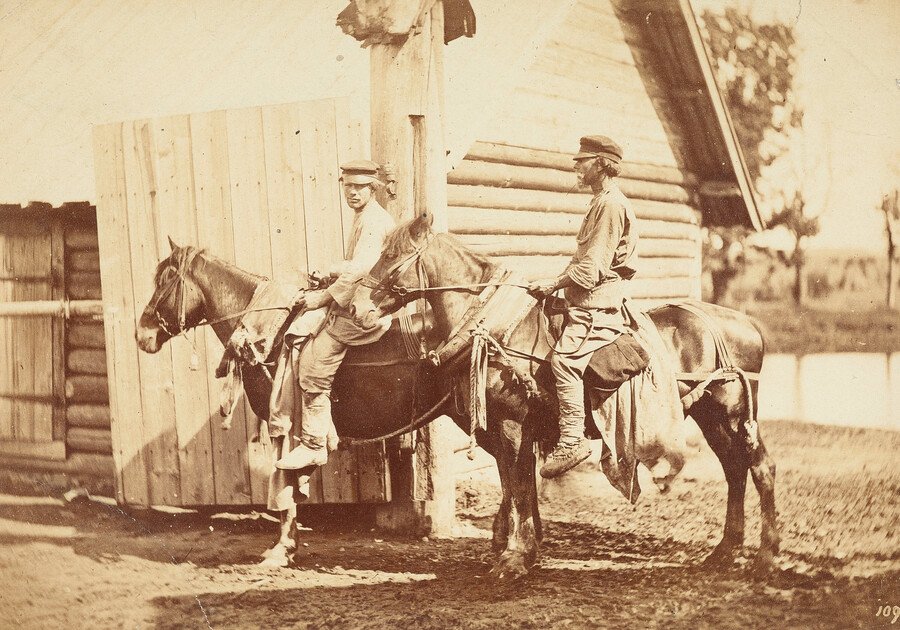 «Крестьяне на лошадях», Вильям Каррик, Симбирская губерния, 1870‑е годы. / «Сцена из крестьянской жизни», Вильям Каррик, серия «Русские Санкт-Петербургской губернии», 1860‑е годы.