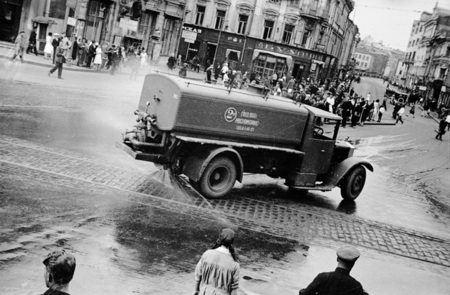 «Поливка улиц», Александр Родченко, 1932 год. / «Остановка трамвая на Сухаревской площади», Александр Родченко, 1928 год.
