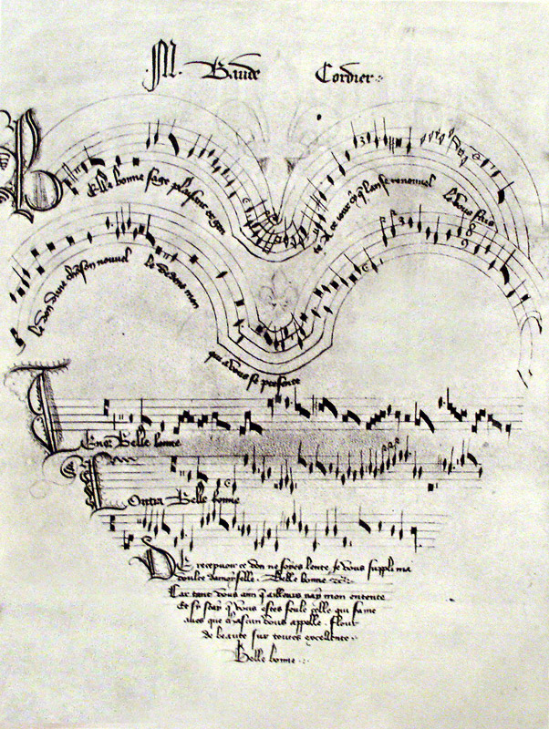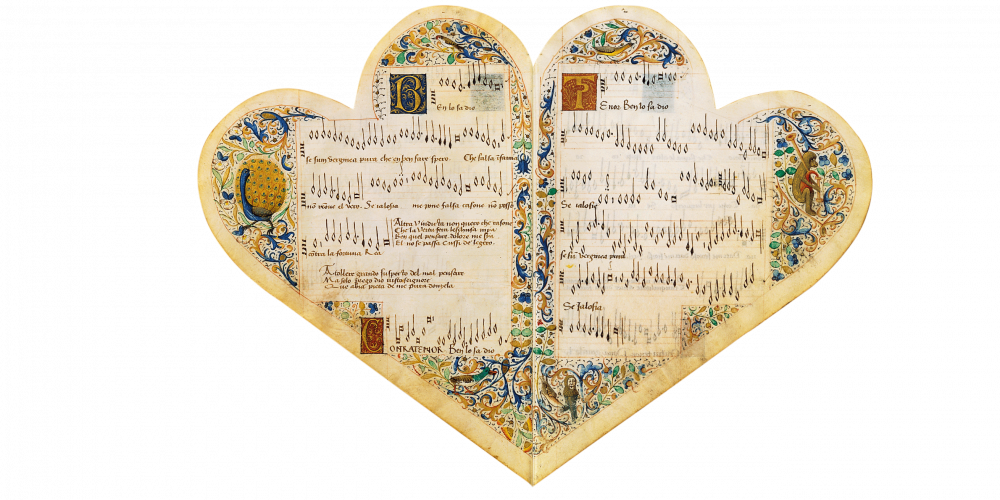 Одним из наиболее значимых источников светской музыки XV века является Chansonnier Cordiforme (около 1470, сегодня хранящийся в Bibliothèque nationale de France, Rés. Vma ms. 148). Этот уникальный манускрипт, оформленный в форме сердца, содержит богатые иллюминации и более 40 светских песен, многие из которых стали основой для парафразных или пародийных месс. В частности, в нём представлены мелодии Аллеманда, Бенхойе и Дюфаи. На одной из миниатюр (лист 1r) изображён аллегорический сад с музыкантами, играющими на лютне и портативном органе, что визуально отражает придворный контекст бытования chansons. Важность этого песенника обусловлена тем, что многие его мелодии встречаются в cantus firmus месс Жоскена, Окегема и их современников.