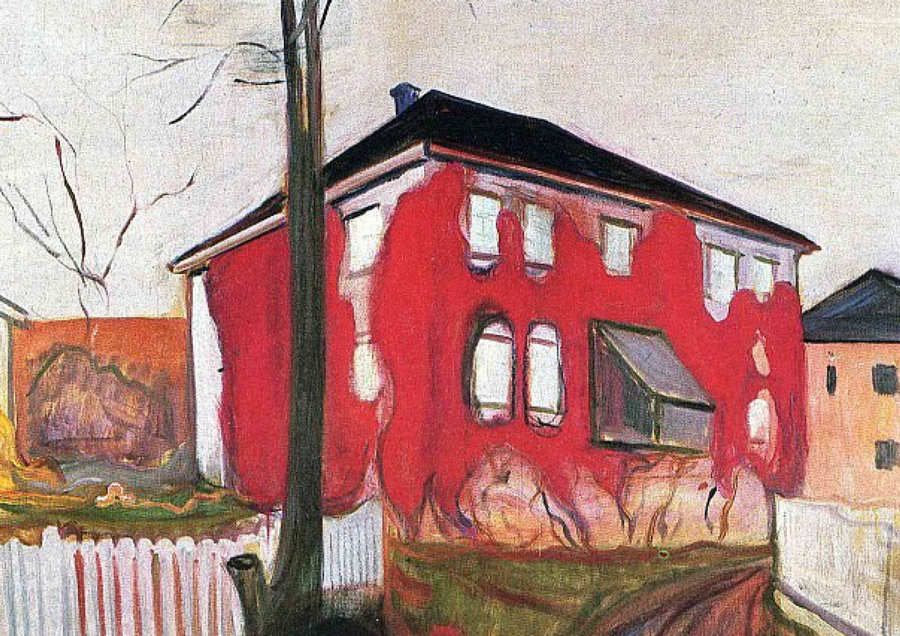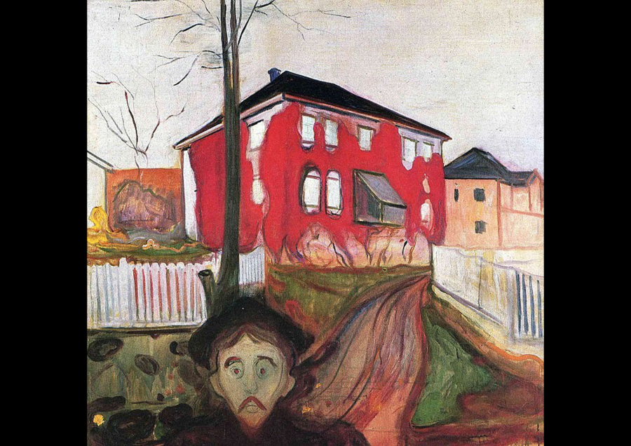 Такой агрессивно-красный цвет в работах Мунка часто усиливает чувство тревоги и паники, передает ощущение страха.