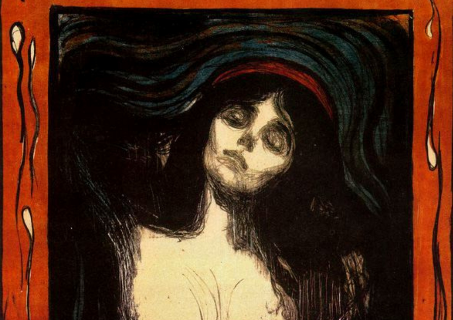 Мунк часто пишет женщин, используя разные оттенки красного, как цвет страсти и соблазнения, греховной любви, ревности и агрессии.