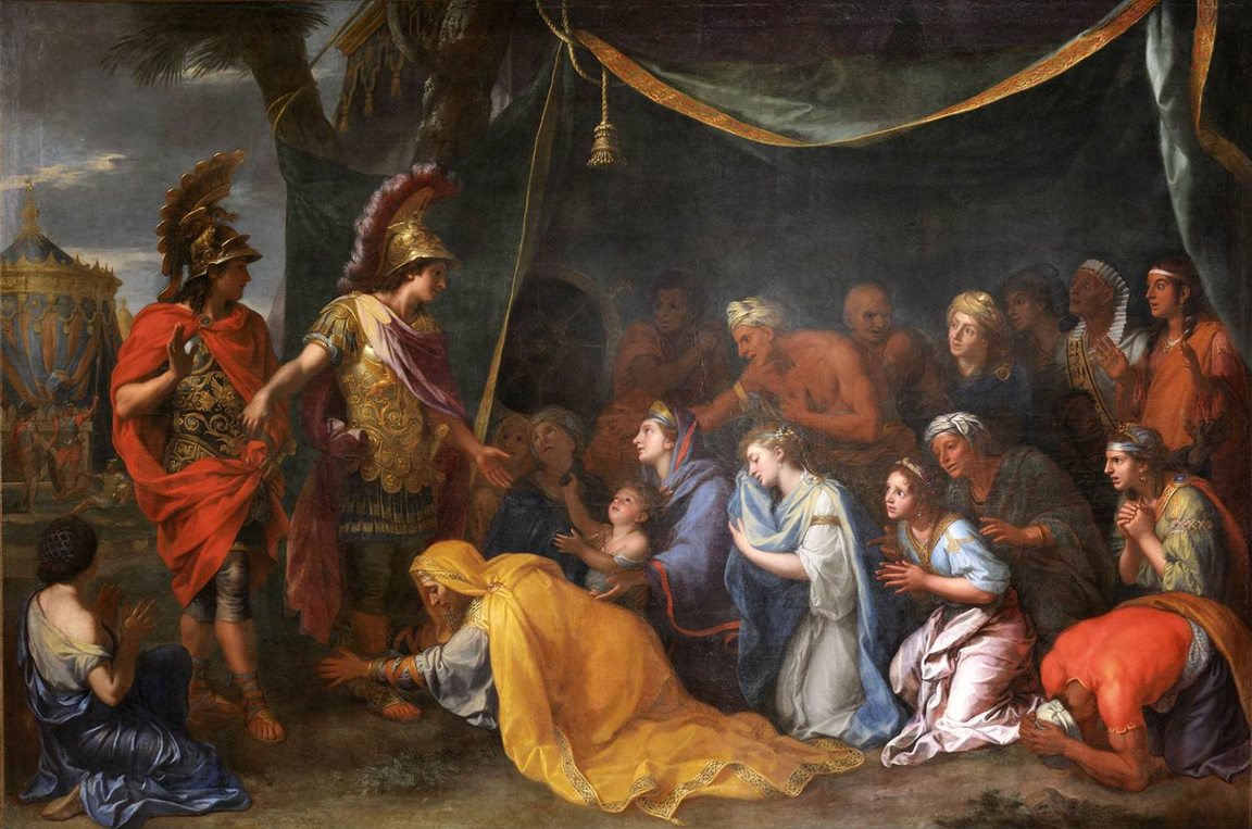 2. The Family of Darius before Alexander | Charles Le Brun | 1660 Александр Великий предстает в позе, напоминающей Цезаря, принимая плененных женщин семьи персидского царя Дария. Он проявляет милосердие, отвергая мольбы о пощаде ради личной выгоды. Композиция подчеркивает идею царственного самоконтроля: победитель владеет не только телами, но и страстями. Для Людовика XIV эта сцена стала визуальной моделью «божественного монарха», чья власть утверждается через великодушие.